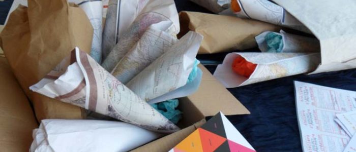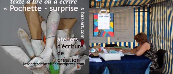 2012 Mai – Marché solidaire Le Hameau des Possibles Caen « Pochette-surprise ! ». Prendre son temps, partir au hasard d’une pochette-surprise et s’offrir une pause de lecture et d’écriture, installation plastique de Nathalie Féron, en partenariat avec la Fête du Printemps et des Solidarités et l’IRTS d’Hérouville-Saint-Clair.